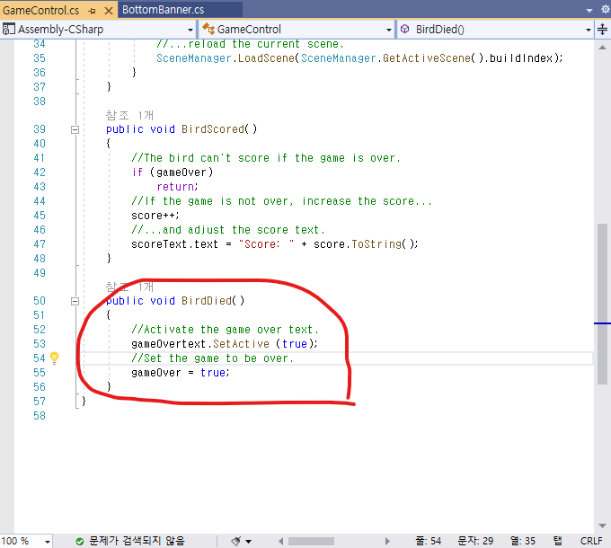 GameControl.cs 의 BirdDied() 함수에서 동작합니다. 이부분에 전면 광고를 적용해 보도록 하겠습니다.
