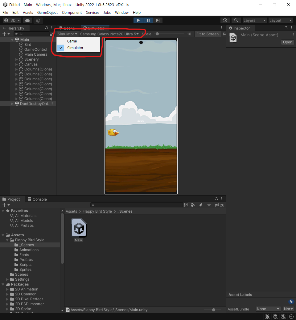 Game 탭에서 Simulator를 선택한다음 Samsung Galaxy Note20 Ultra 5G를 선택합니다.
