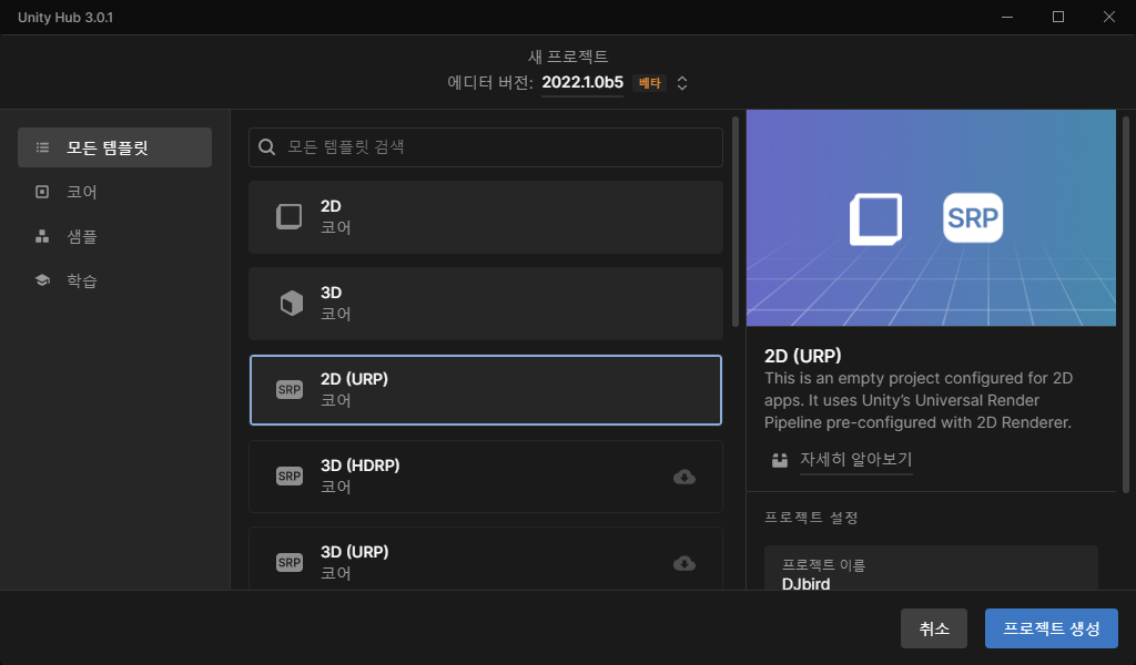 나중에 URP로 업그레이드 할 예정이기 때문에 시작을 URP로 해보겠습니다.