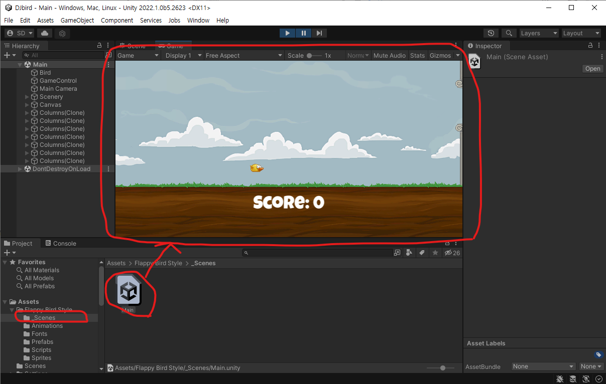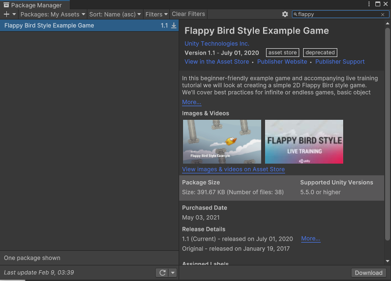 assetstore에서 Flappy Bird를 찾아봅니다.