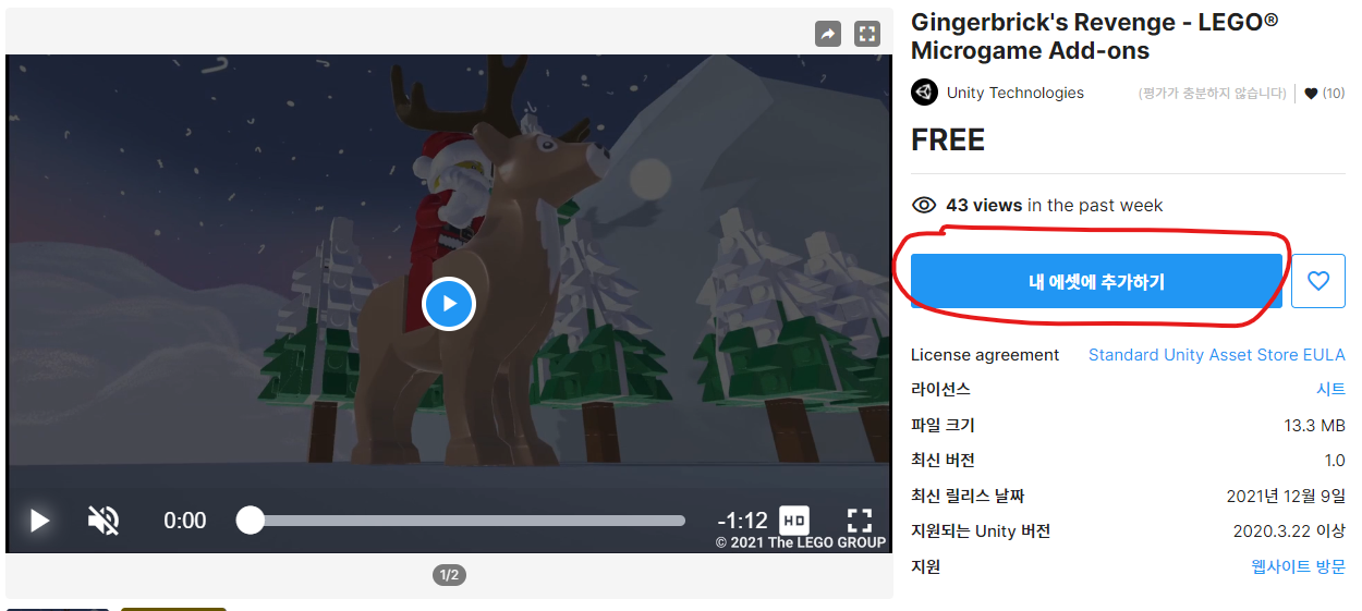 AssetStore에서 "내 에셋에 추가하기" 버튼을 클릭하여 패키지를 임포트 합니다.
