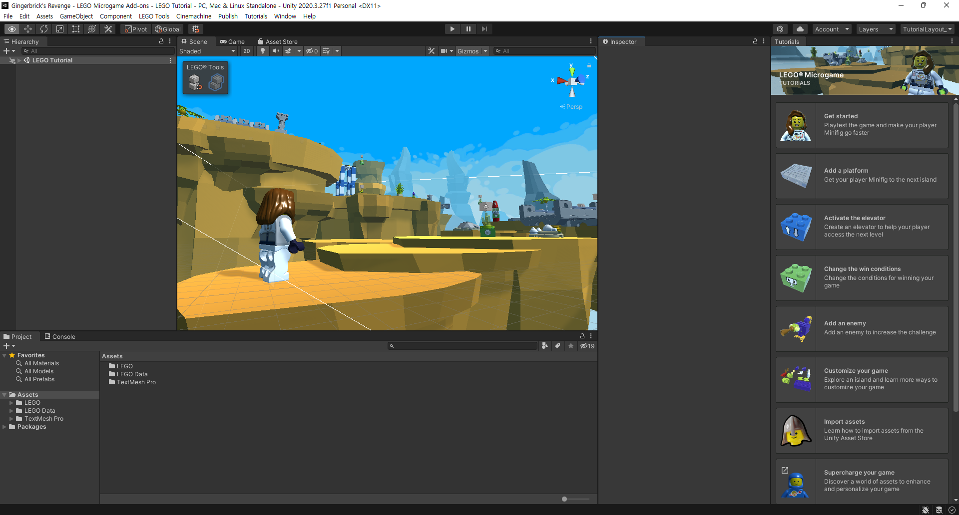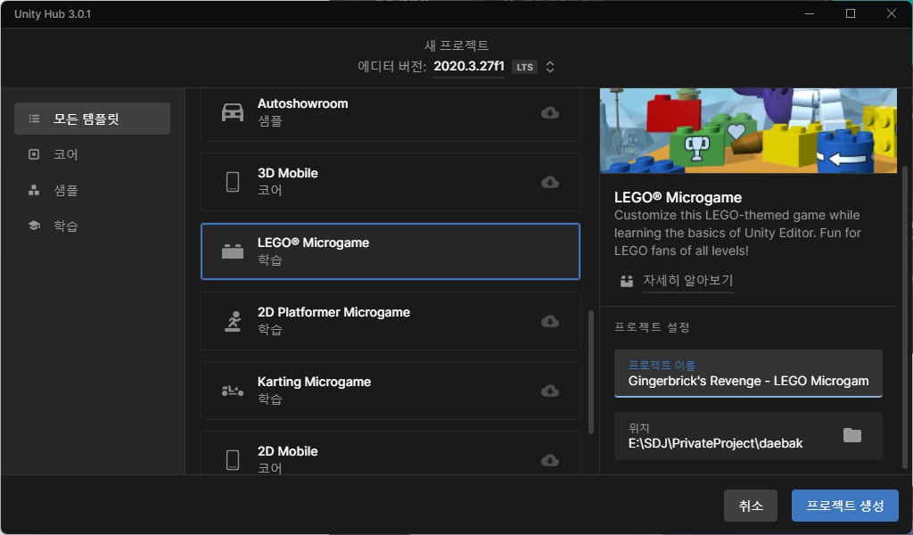 먼저 유니티 2020.3.27f1 버전 LEGO Microgame프로젝트를 생성합니다.