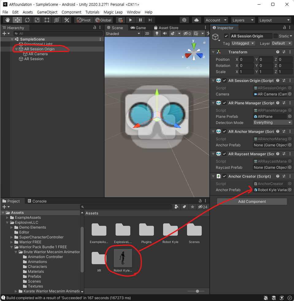 Kyle 의 rig 을 휴머노이드로 변경하고, Warrior Pack에 있는 애니메이션을 Kyle에 연결합니다.프리팹으로 저장하고 이 프리팹을 AR Session Origion의 Anchor Creator에 연결합니다.