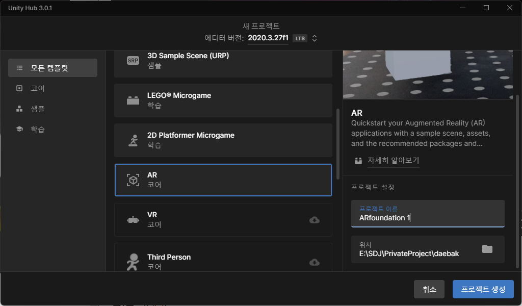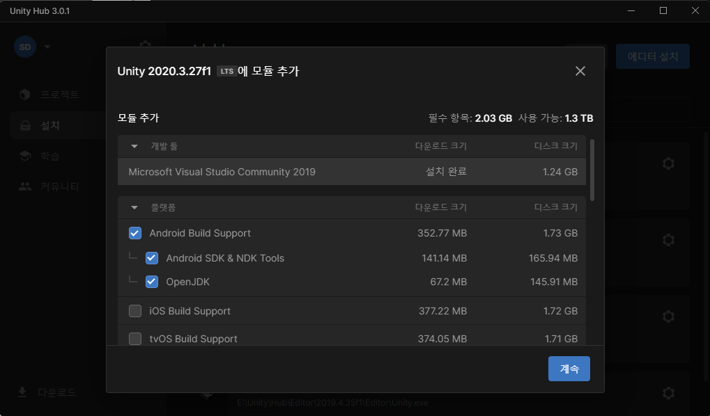 안드로이드에서 AR 동작을 확인할 것이기 때문에 UnityHub에서 안드로이드 모듈을 설치합니다.
