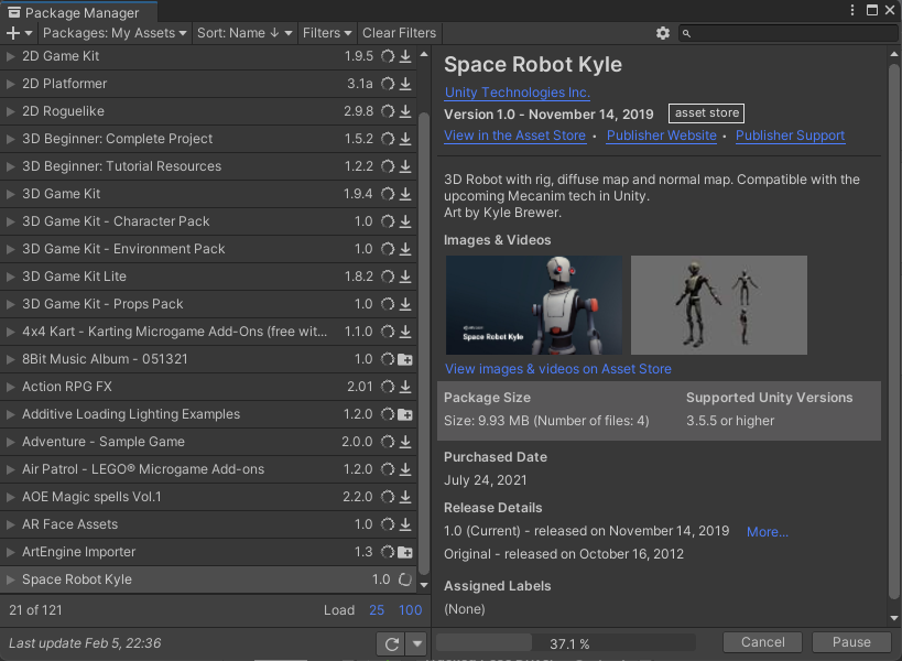 유니티 에셋스토어 에서 Space Robot Kyle을 Import 한다.