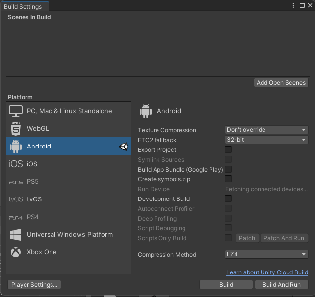 File -> Build Setting을 클릭하여 Android로 빌드합니다.