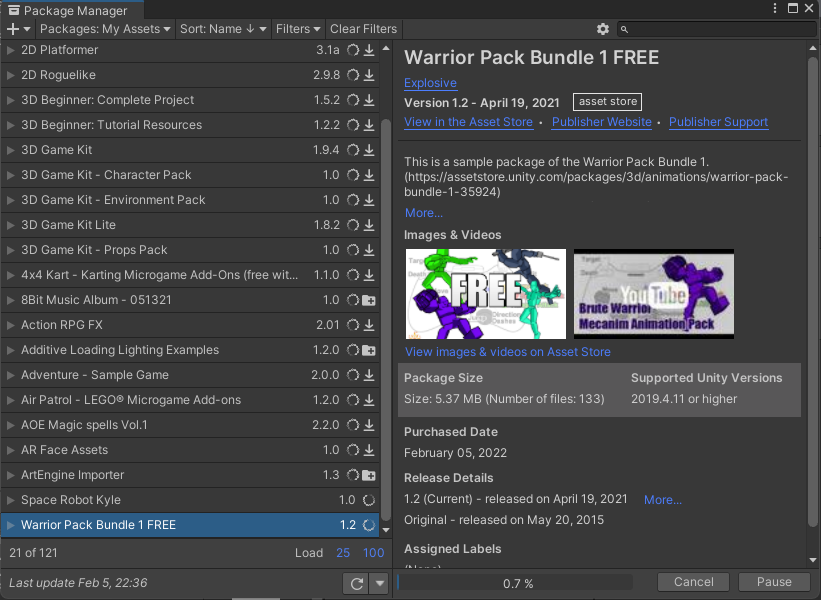 그리고 애니메이션 적용을 위해서 "Warrior Pack Bundle 1 FREE" 를 Import 한다