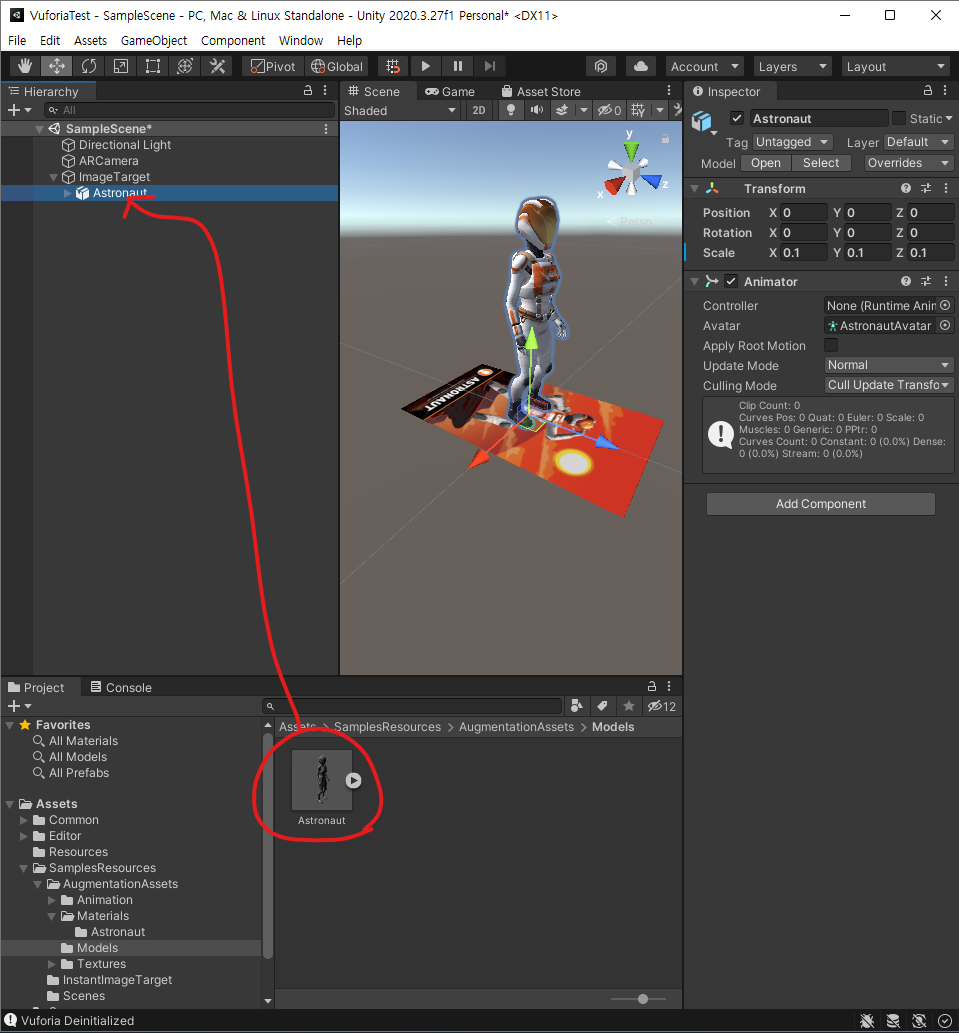 Model 폴더에서 모델을 Drag하여, ImageTarget에 Drop 합니다.