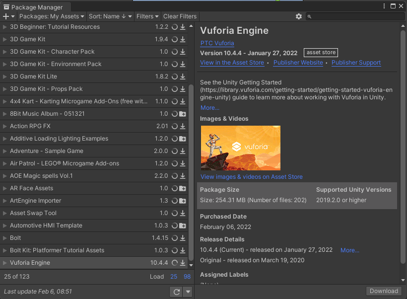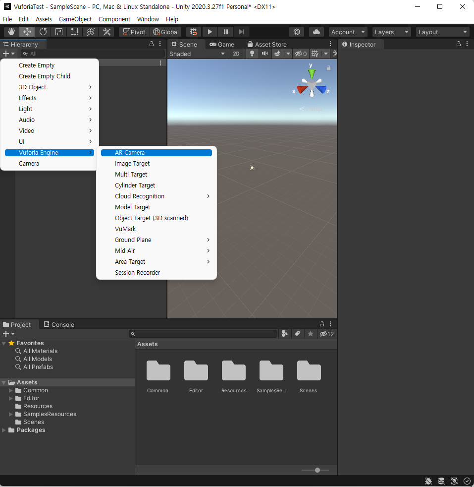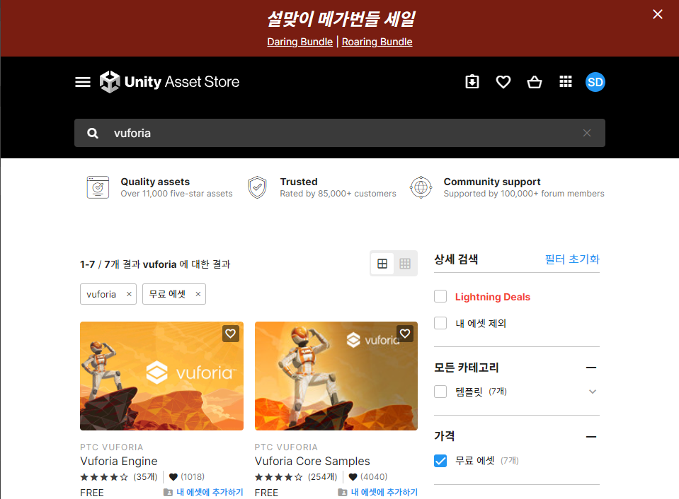 프로젝트 생성이 완료되면 AssetStore에서 Vuforial Engine을 검색하여 프로젝트에 Import 합니다.