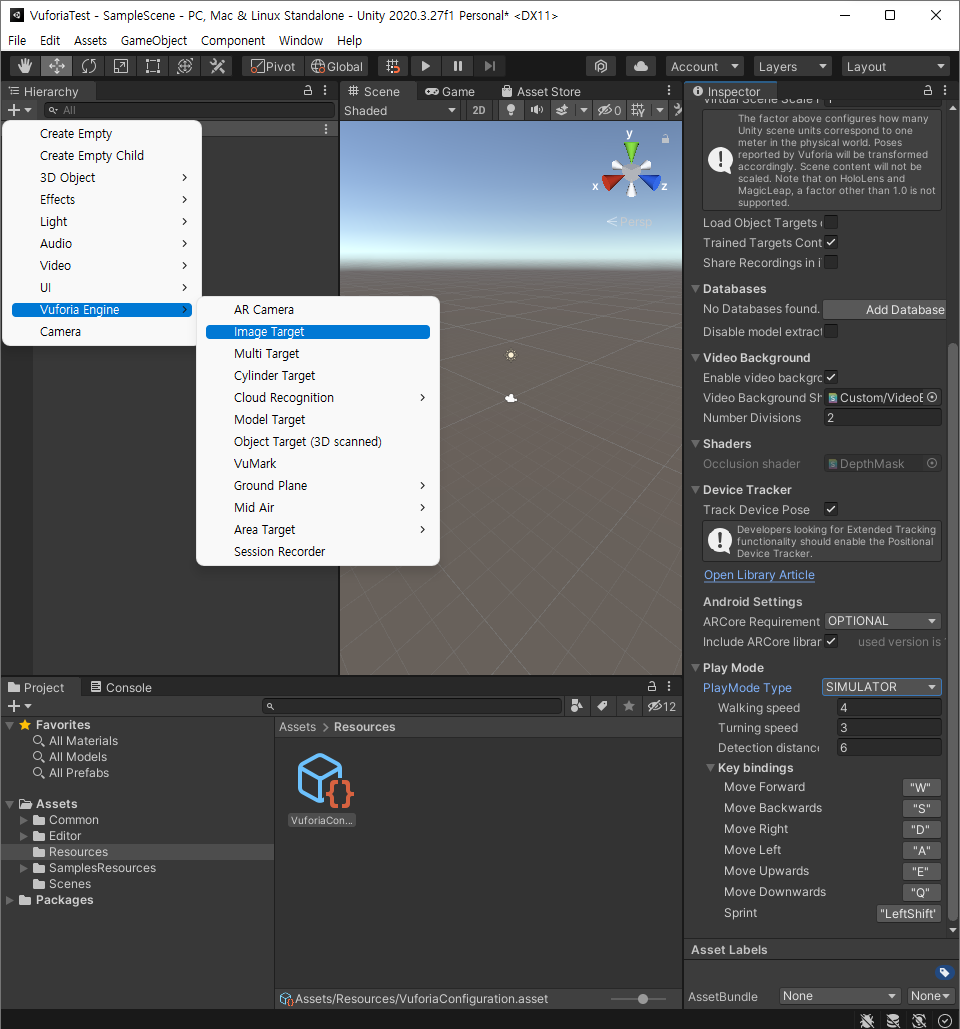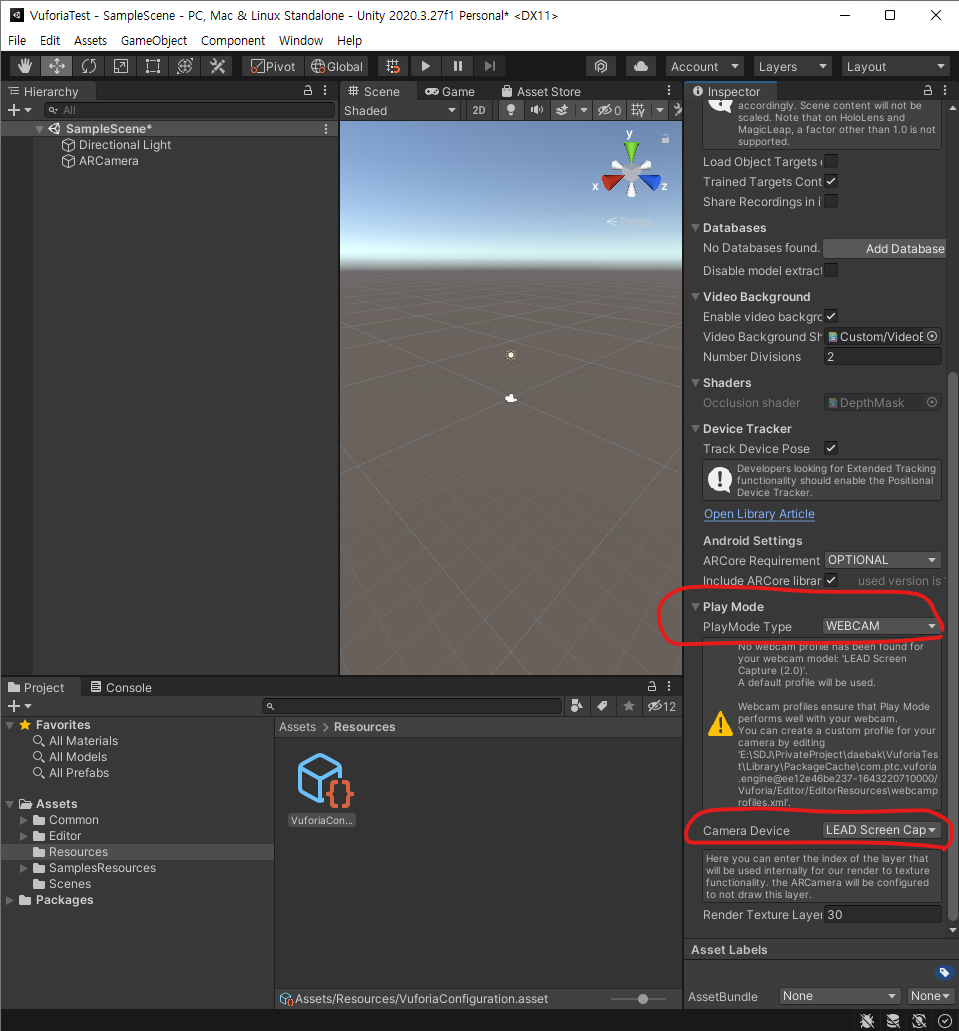 Open Vuforia Engine configuration 을 클릭하여 Play Mode 의 웹카메라를 변경할 수 있습니다.