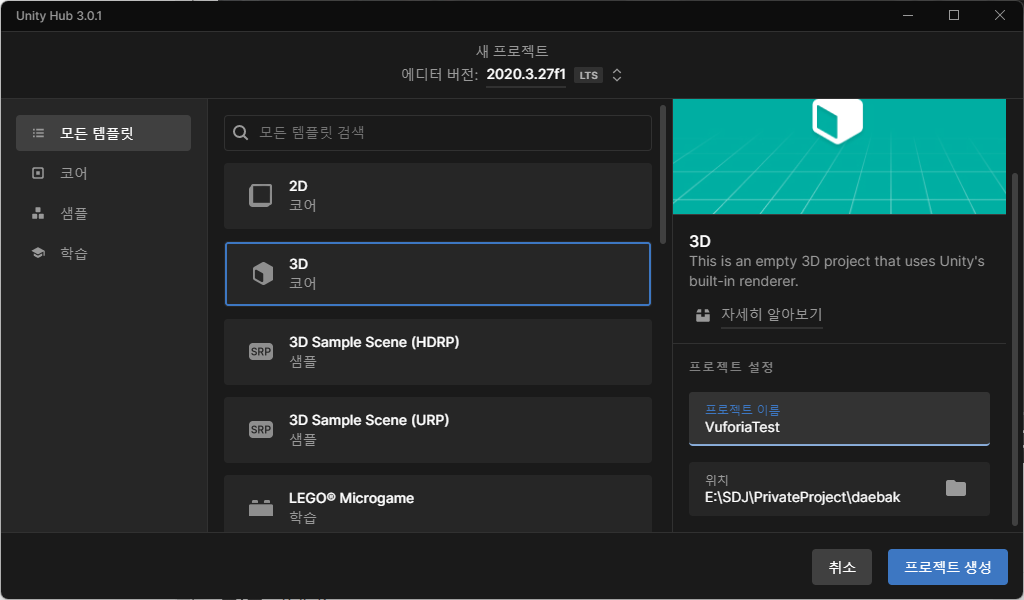 AR 프로젝트이긴 하나 뷰포리아를 사용하기 때문에 그냥 3D로 프로젝트를 생성합니다.