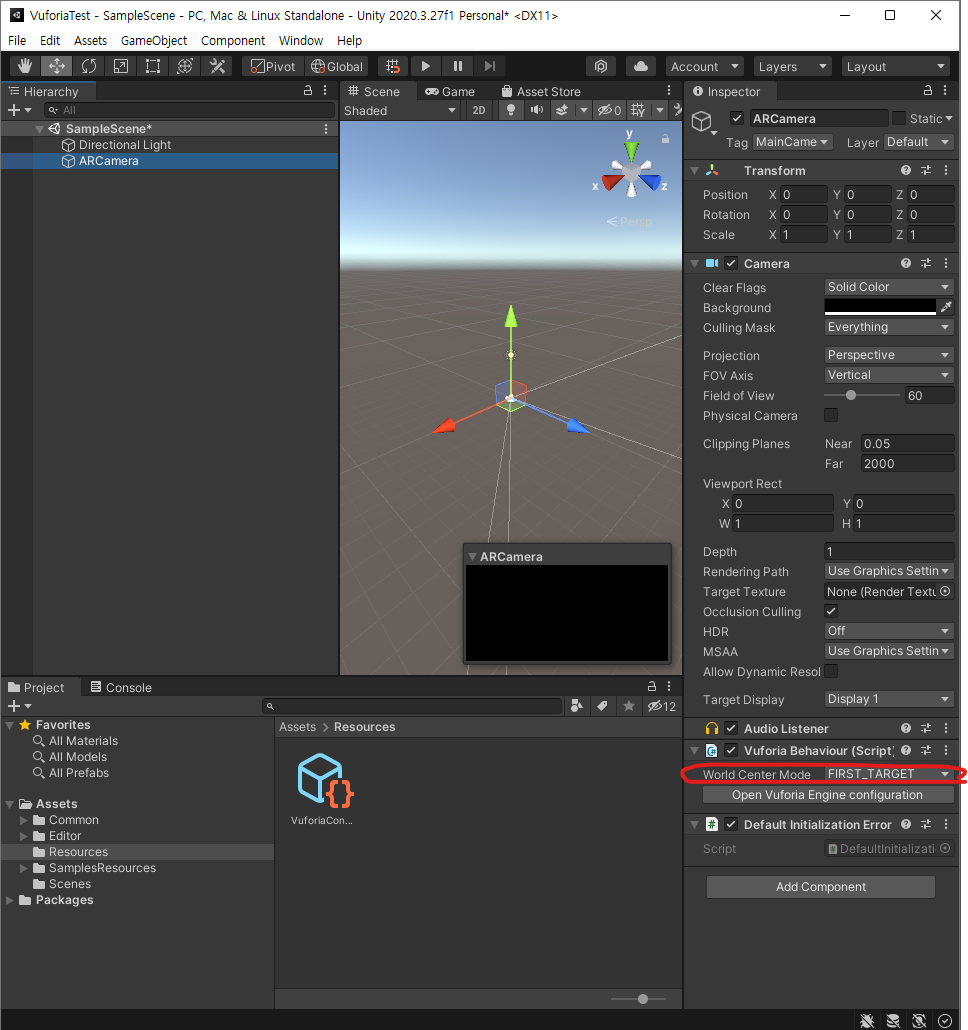 기존 카메라 지우고 Vuforia AR Camera를 추가합니다.