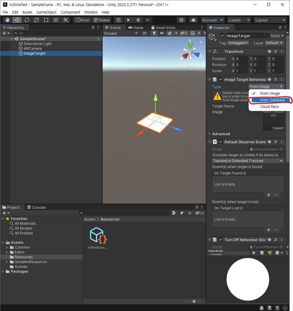 ImageTarget에 정확히 Drop 해야 ImageTarger에 종속되어 들어갑니다.