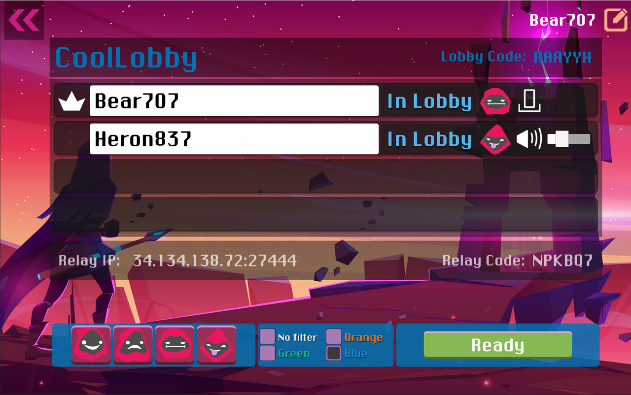 이 샘플은 로비 및 릴레이 패키지를 사용하여 일반적인 게임 로비 경험을 만드는 방법을 보여줍니다. 플레이어는 공개 로비 목록 또는 로비 코드를 사용하여 다른 플레이어가 참여할 수 있는 로비를 호스팅한 다음 Relay와 연결하여 Unity Transport("UTP")를 사용하여 기본 실시간 통신을 할 수 있습니다. 릴레이를 사용하면 연결 익명성을 유지하면서 플레이어가 서로 안전하게 통신할 수 있습니다.
